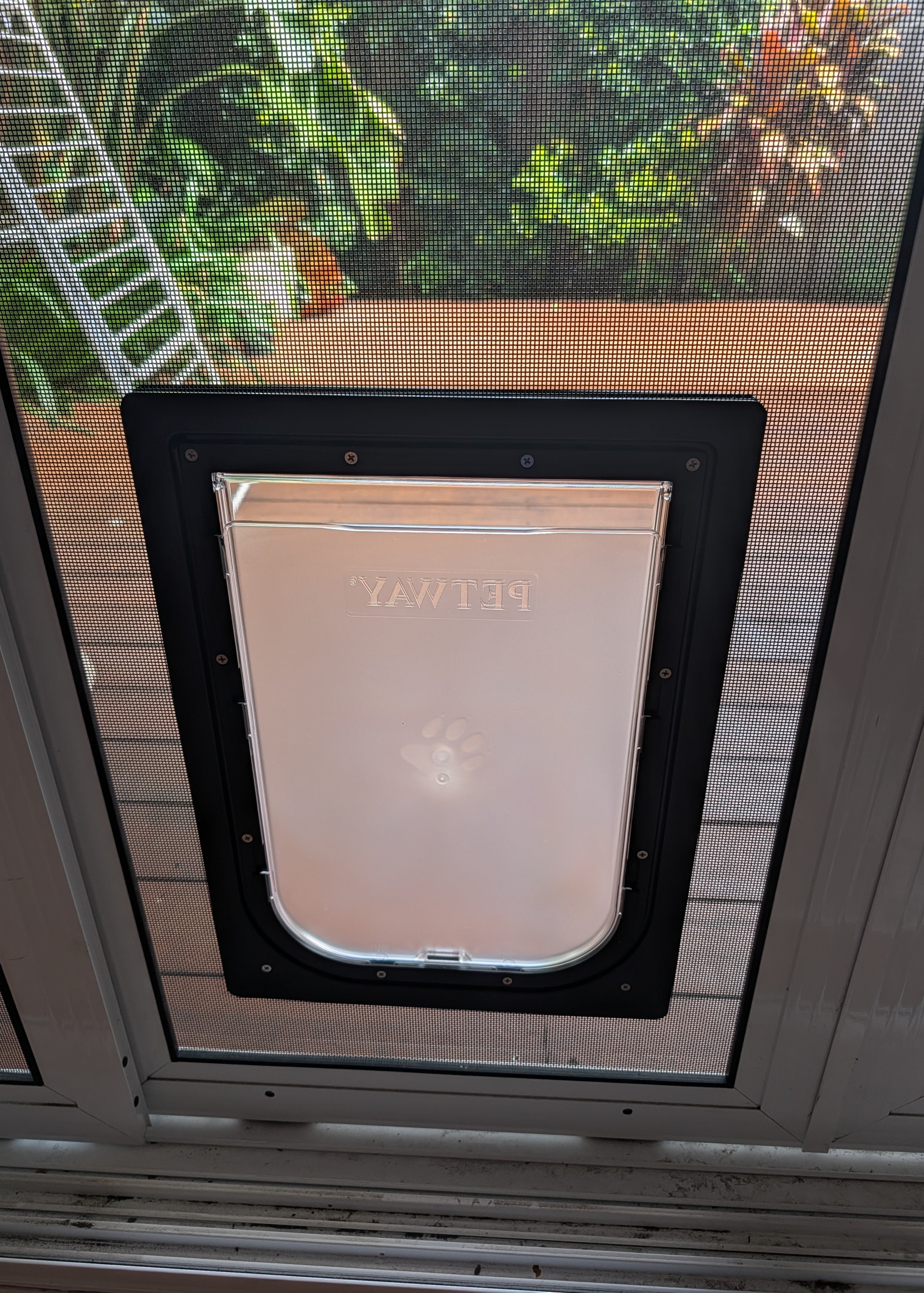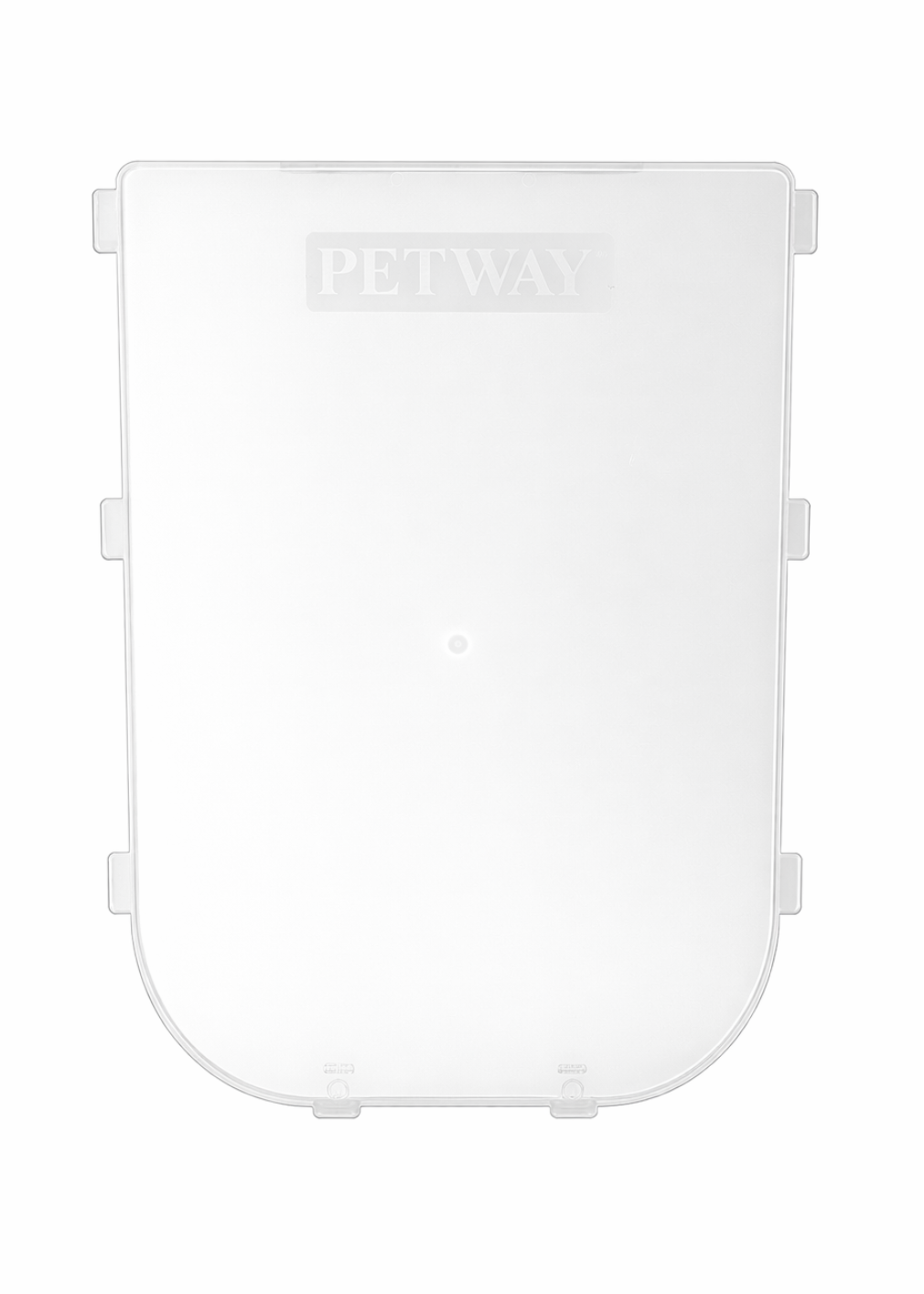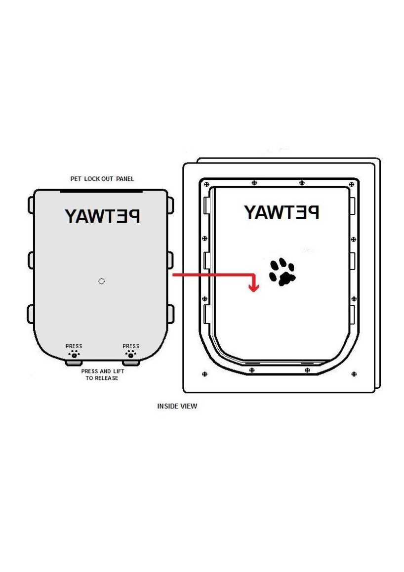 Step 1: Insert the lock-out panel into the back frame of the pet door by angling the panel slightly, placing one side into the frame first, then gently guiding the other side into position until it sits securely.
